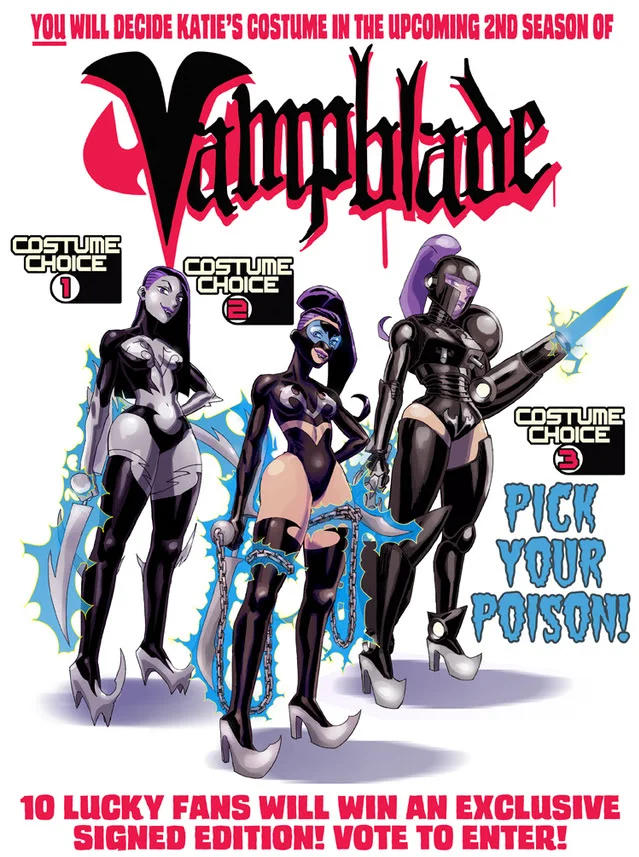 Jason Martin's hit series returns with regular series artist Winston Young, and serious upgrades as the fans decide her new costume in the fallout of events from Vampblade Season One #12. While details are being held close to the vest, fans can log in to vote for their favorite costume here.