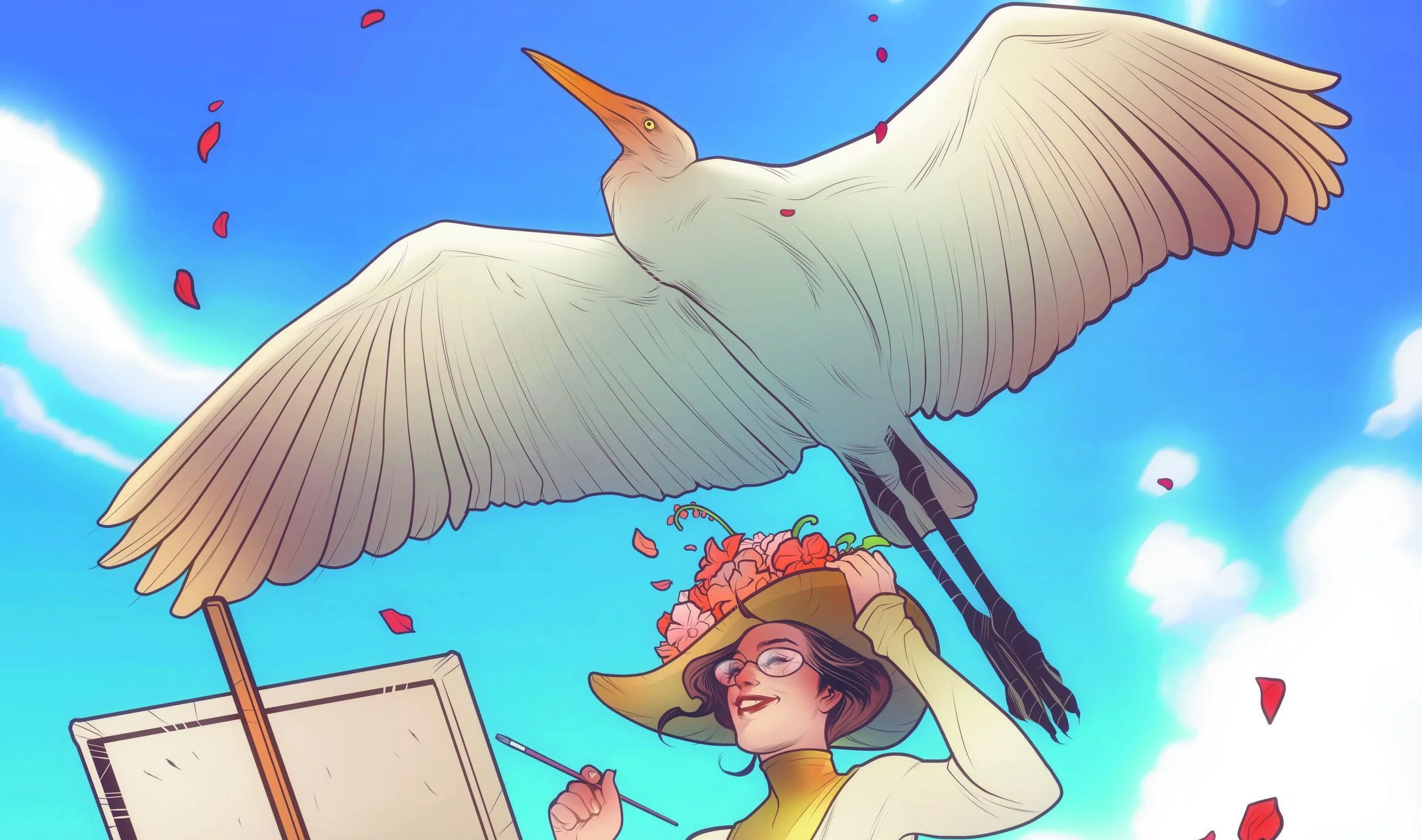 A slightly surreal tale of an art thief and her sidekick, a talking egret who gets just a bit bigger after each successful caper, as they embark on a escalating series of daring thefts of world-famous paintings, and dodge pursuers in an increasingly weirdly dangerous game of cat-and-mouse.