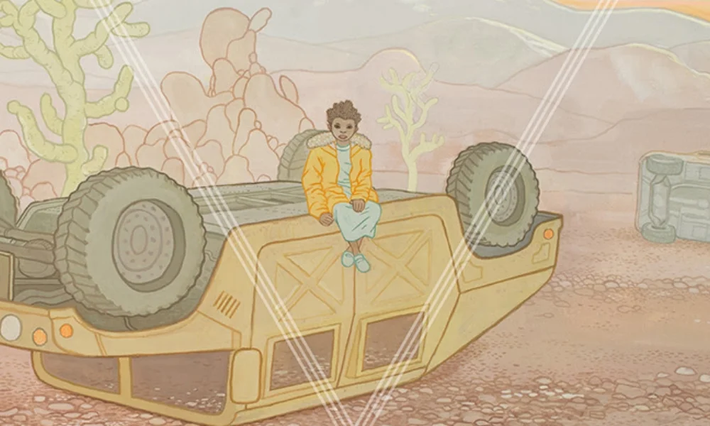 Set in a version of modern Central Asia, Tongues is a retelling of the Greek myth of Prometheus. It follows the captive god’s friendship with the eagle who carries out his daily sentence of torture, and chronicles his pursuit of revenge on the god that has imprisoned him. Prometheus’ story is entwined with that of an East African orphan on an errand of murder, and a young man with a teddy bear strapped to his back, wandering aimlessly into catastrophe (readers may recognize this character from Nilsen’s Dogs and Water). The story is set against the backdrop of tensions between rival groups in an oil-rich wilderness.