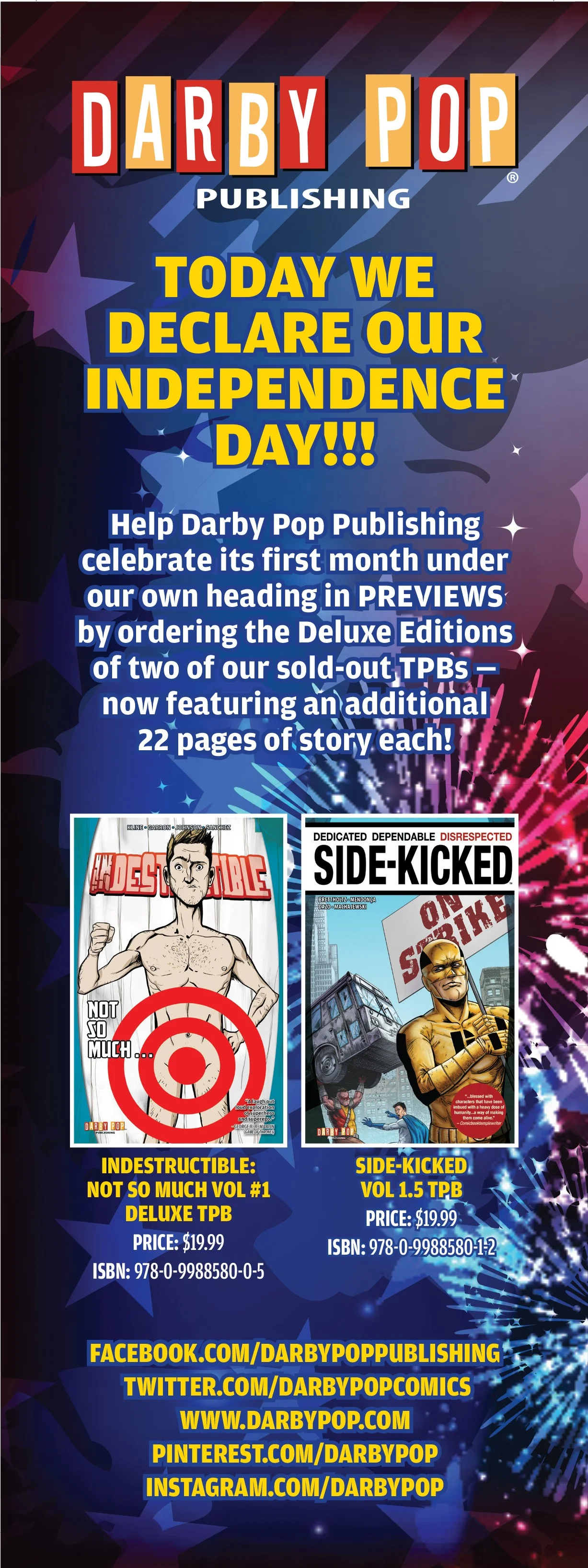 To celebrate their first month as a solo act, Darby Pop will release Deluxe Editions of two of their previously sold-out trade paperbacks, Indestructible: Not So Much and Side-Kicked -- each now featuring an additional 22 pages of story. Ironically, Indestructible was Darby Pop’s first-ever title released in conjunction with IDW Publishing, while Side-Kicked was Darby Pop’s initial release through Magnetic Press.