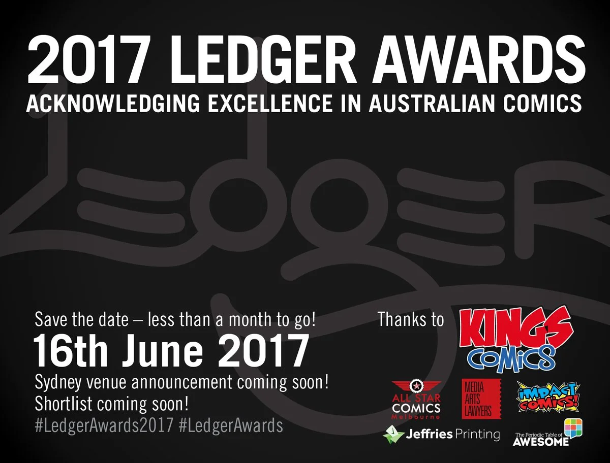 Gold, Silver and Bronze Ledgers will be presented for outstanding comics work published in the calendar year January 1 to December 31, 2016. A single Platinum Ledger will be presented to acknowledge an individual's contribution to the comics making community in Australia, someone who selflessly helps to further the form and advance its creators. Two Ledgers of Honour (a “hall of fame” award) will also be announced, in recognition of those from the rich past of Australian comics who helped shape the art form in a meaningful way.