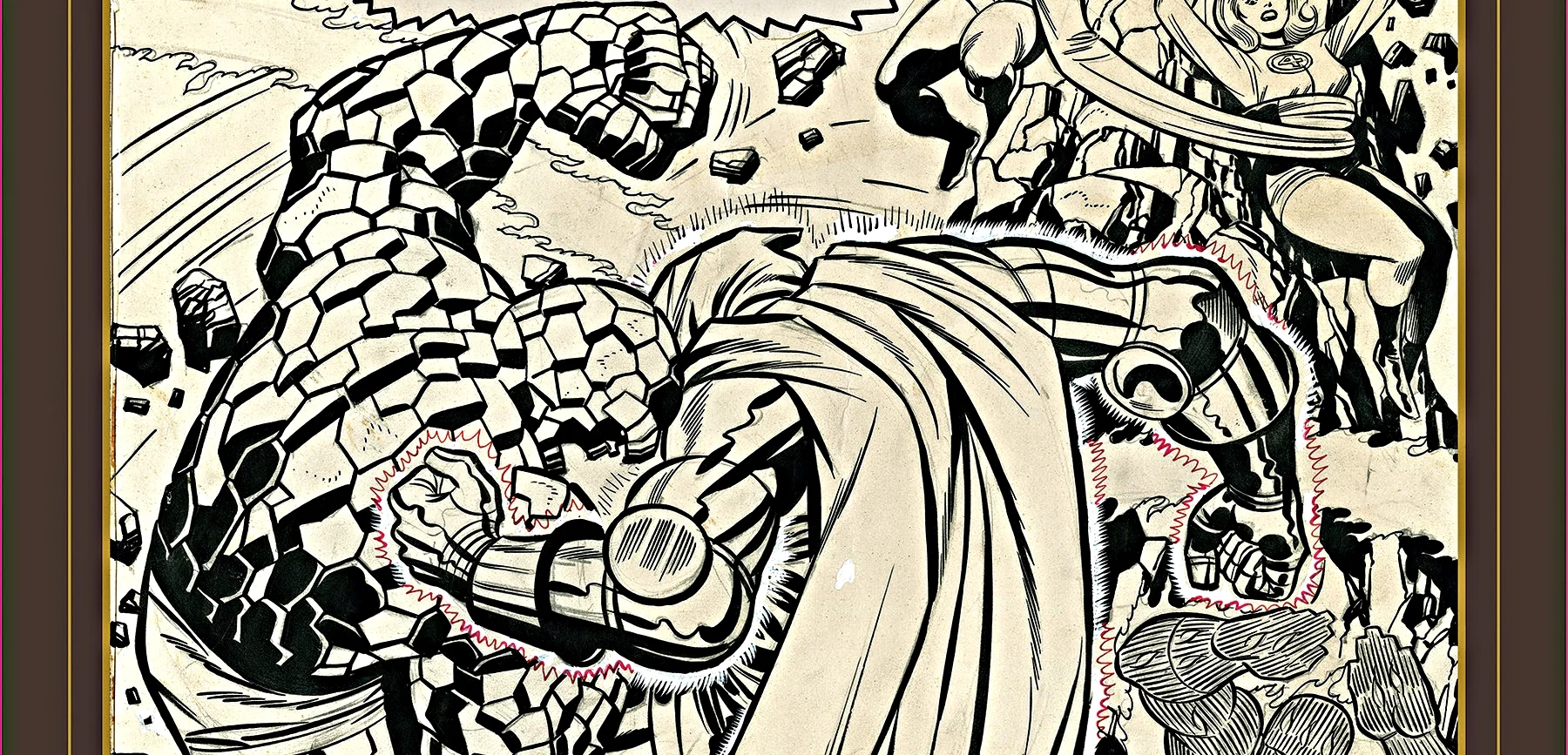 Clocking in at 168 pages and measuring a huge 15” x 22”—the same size as Kirby’s original art—this book will feature four complete “twice-up” stories from the absolute prime of the run: Issue #33 (“Side-by-Side With the Sub-Mariner”), #45 (“Among Us Hide… the Inhumans!”), #47 (“Beware the Hidden Land!”), and #60 (“The Peril and the Power!”). The last issue is the final chapter of the classic storyline in which Dr. Doom steals the Silver Surfer’s board!