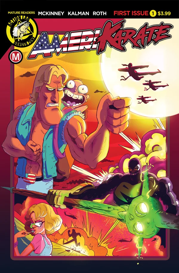 Right now, comics are going through its nostalgia phase. Looking back at days of yesteryear and coming up with stories that fit perfectly in that era, but with the foresight of calling out the shortcomings at the same time. Usually in a humorous way as it is with AmeriKarate which is a hybrid of Footloose, Roadhouse, and American Ninja… there was a Rambo reference as well.