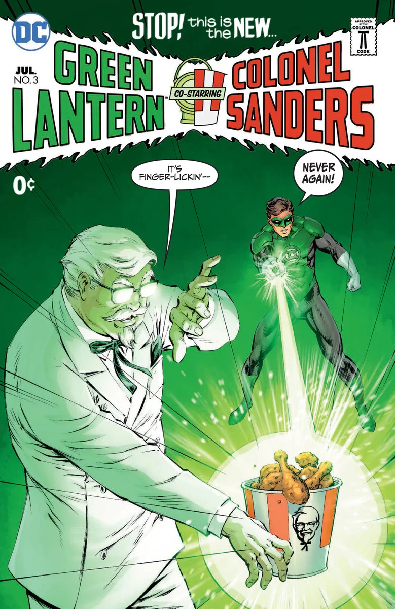 The Colonel wants to send Chicken Sandwich Zingers into space to feed all the hungry voices that he’s tuned into hearing… that’s the goddamn plot to this comic, and if you don’t just love that shit, then I question why you’re even reading comic books. To help with that, he enlists Hal Jordan and the entire Green Lantern Corps (Pre-New 52, which I feel is worth mentioning). They start shooting space buckets into space for aliens to eat and someone is stealing them. Ha, fucking someone is stealing the Zingers because they’re so fucking good and the Colonel is pissed about it. Doesn’t take much for anyone to figure out whodunit. Just think about the rings and which spectrum would make the best fast food customer and bang you got it. What’s even better about this is that at the end the Colonel is going to open up his first restaurant on said villain’s home planet, train his people to cook the food to his standards and fucking own the place… I wish I were making this shit up, but it’s too good to be true.