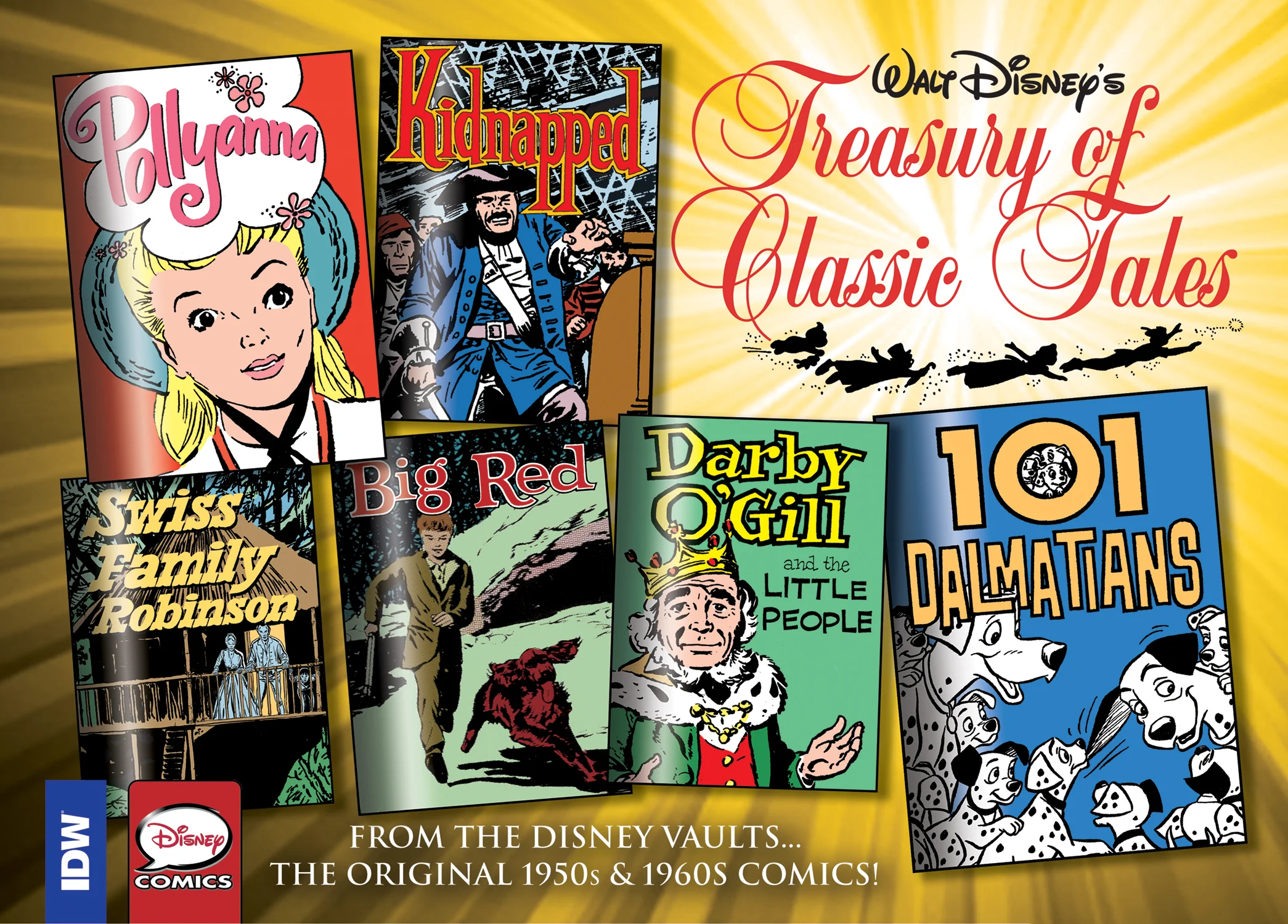 I started Kidnapped, but haven’t finished it quite yet. I can say that the beginning is very different and the comic of it here did not do much to make me feel like I actually understand all of what is happening. If this is a result of the story itself, or just the cuts made due to available space, I’m not entirely sure. The character development here lacks significantly and it is hard to really get into the action. It is an intriguing story, but it feels more like a trailer for the film than a comic to enjoy on its own. I’ll have to watch the movie to see what is actually going on there because the comic is not that helpful. It provides only the barest of bones, maybe with a femur or two missing in the structure that should’ve been present to hold the whole thing together in a coherent way. Kidnapped, Moon Pilot and Bon Voyage seem to me as being the least interesting and clunky stories in the collection. In Search of the Castaways makes decent sense as far as general plot goes, but it feels a bit rushed, so it ultimately isn’t that satisfying of a comic compared to Third Man on the Mountain or Pollyanna. 101 Dalmatians is pretty good, but we get no Cruella de Vil song snippet (just one bit of it in the background of a panel would’ve been nice since it such an iconic part of that film), and very little of Cruella. She isn’t driving like a hell demon after the puppies, so she feels largely absent from the story apart from one initial appearance and two quick mentions by Perdita and the henchmen (Horace and Jasper).